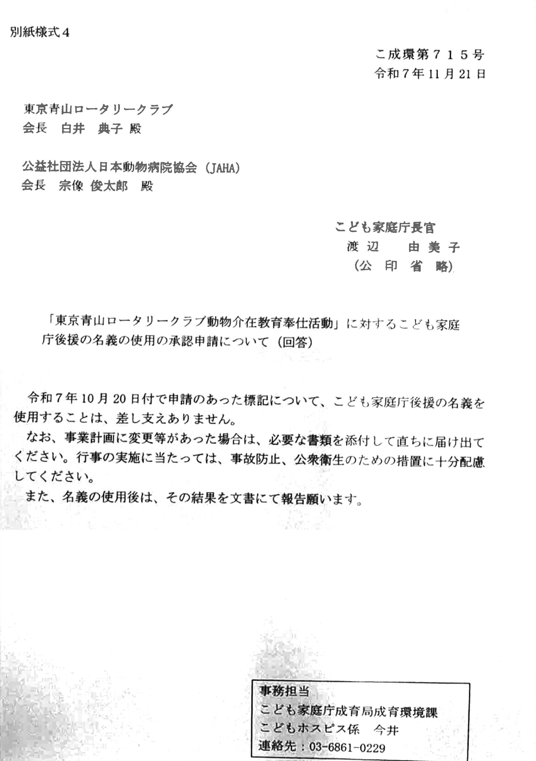 米山奨学生 単さんの卓話 - 「東京青山ロータリークラブ動物介在教育奉仕活動」に対するこども家庭庁後援の名義の使用を、また文科省でも後援を承認されました。