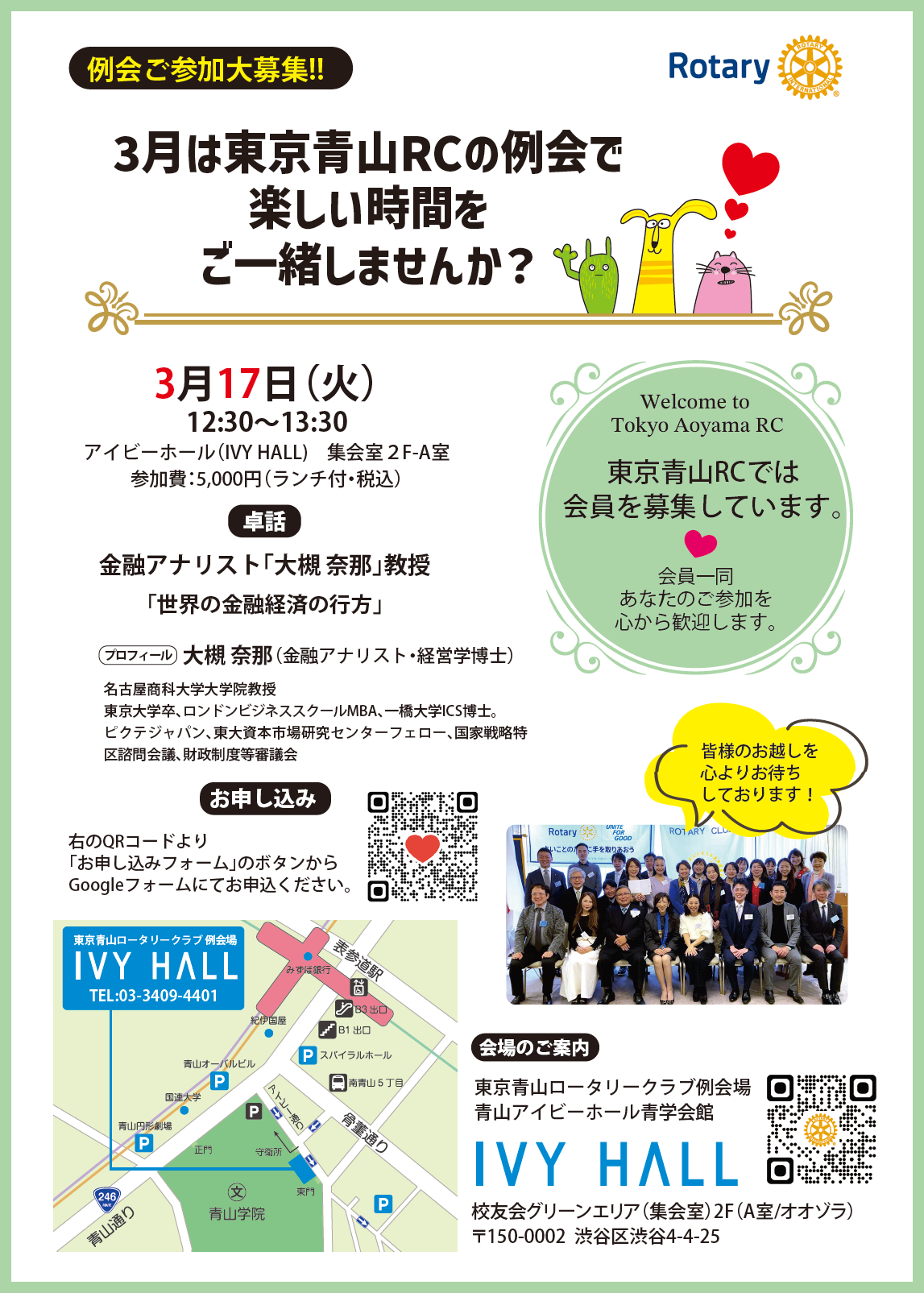 例会☆1446回 2026年3月17日 11:00 理事会 12:30 例会 会場:アイビーホール(IVY HALL) 集会室2F-A室 〒150-0002 東京都渋谷区渋谷4-4-25 東京メトロ表参道駅B1/B3出口より徒歩5分 会場TEL 03-3409-4401 会場マップはこちらから 卓話:金融アナリスト「大槻 奈那」教授 「世界の金融経済の行方」 お申し込みフォーム
